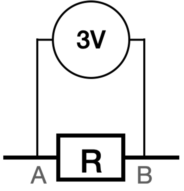 Avec un voltmètre on peut aussi mesurer la tension aux bornes d’une résistance. Le voltmètre dans le schéma ci-dessous montre une tension de 3 V entre le point A et B. Cela signifie que chaque coulomb d’électricité délivre 3 joules d’énergie à la résistance électrique.