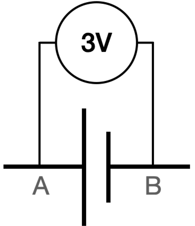 Pour mesurer la tension entre deux points on branche le voltmètre en parallèle sur deux points différents d’un circuit. Par exemple dans le schéma ci-dessous, le voltmètre indique une tension électrique de 3 V entre le point A et B, aux bornes du générateur. Cela signifie que chaque coulomb d’électricité gagne 3 joules d’énergie entre le point A et B.