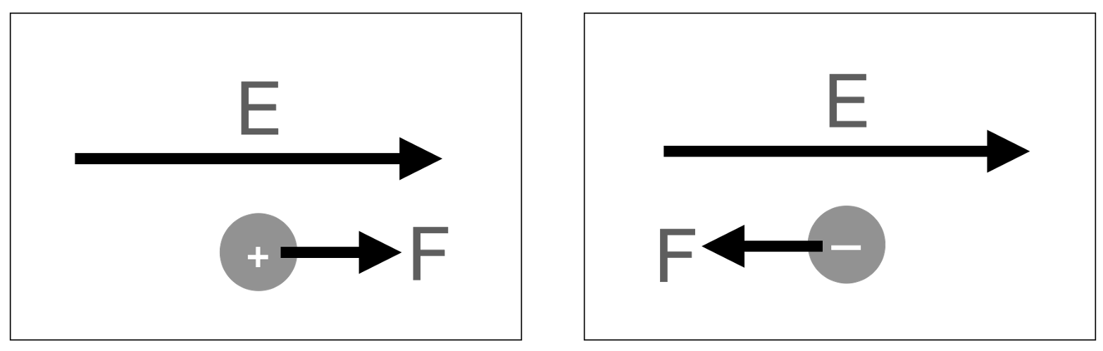 Une charge électrique positive plongée dans un champ électrique subit une force de même direction et de même sens que le champ. Une charge électrique négative plongée dans un champ électrique subit une force de même direction mais de sens opposée au champ :