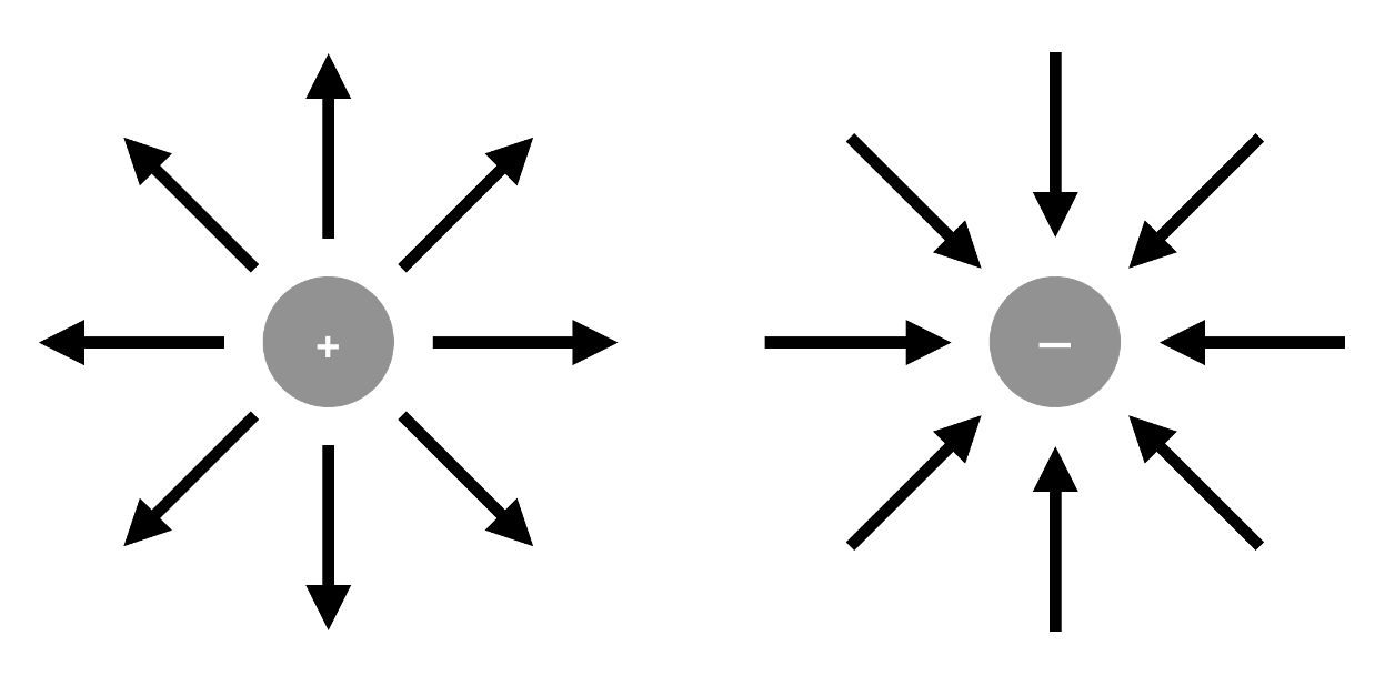 La direction d’un champ électrique dépend du signe de la charge électrique qui l’engendre : si la charge est positive alors les vecteurs représentant le champ sont centrifuges. Si la charge est négative alors les vecteurs représentant le champ sont centripètes :